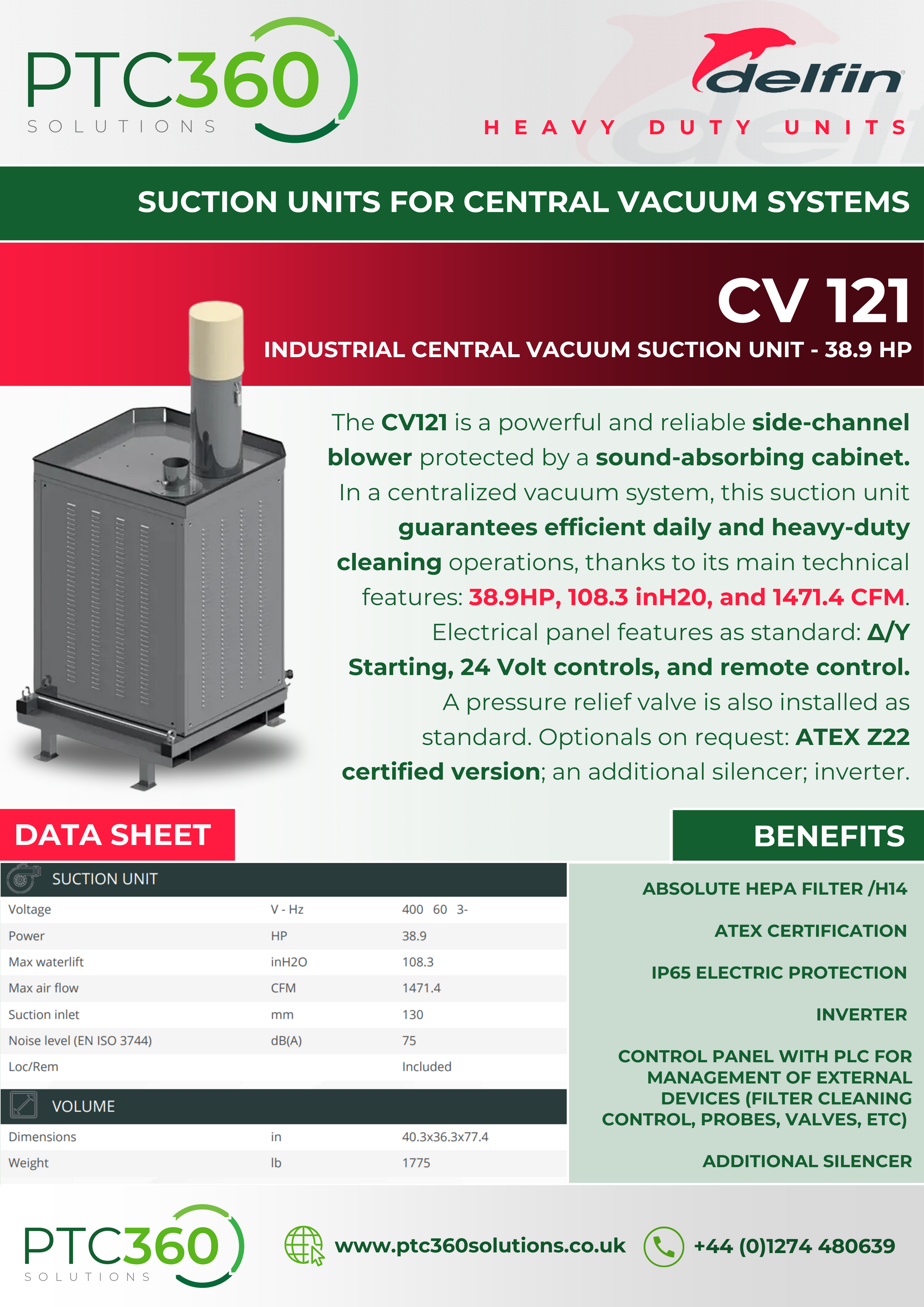 The CV121 is a powerful and reliable side-channel blower protected by a sound-absorbing cabinet. In a centralized vacuum system, this suction unit guarantees efficient daily and heavy-duty cleaning operations, thanks to its main technical features: 38.9HP, 108.3 inH20, and 1471.4 CFM. Electrical panel features as standard: Δ/Y Starting, 24 Volt controls, and remote control. A pressure relief valve is also installed as standard. Optionals on request: ATEX Z22 certified version; an additional silencer; inverter.